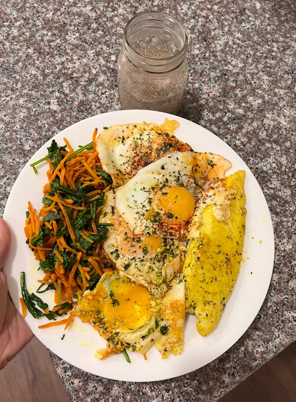 Post workout meal (weights + cardio): 51 total grams of protein through eggs 🍳 + fish 🐠 + chia seeds 🌱+ sautéed carrots 🥕 and greens 🥬in olive oil, turmeric, black pepper, and pink Himalayan sea salt. Happy 😊 Monday ❣️