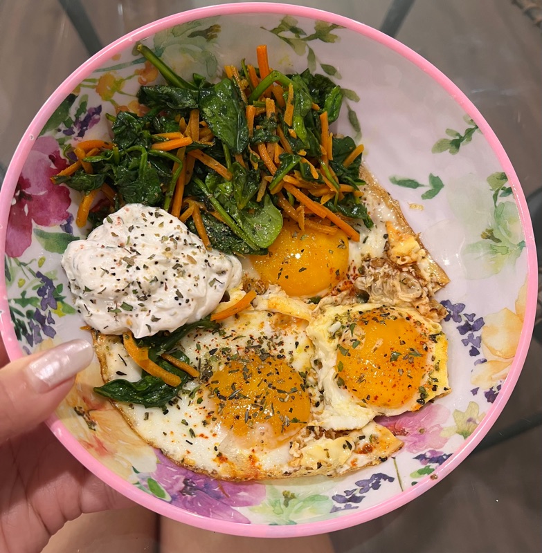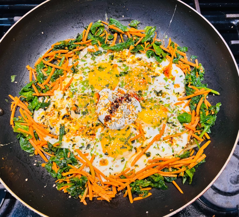 Post workout meal (weights + cardio): 51 total grams of protein through eggs 🍳 + fish 🐠 + chia seeds 🌱+ sautéed carrots 🥕 and greens 🥬in olive oil, turmeric, black pepper, and pink Himalayan sea salt. Happy 😊 Monday ❣️