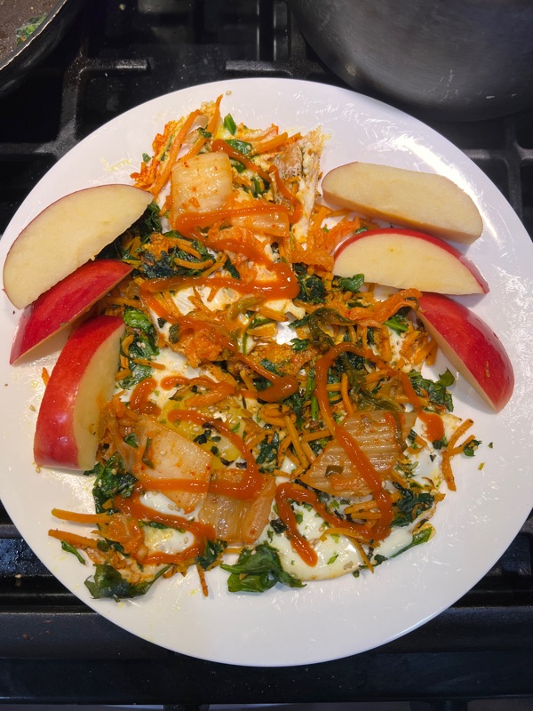 Eggs 🍳 with sautéed veggies 🥗 topped with kimchi and sriracha sauce with sliced apples 🍎 on the side👌 😋 👌 💛